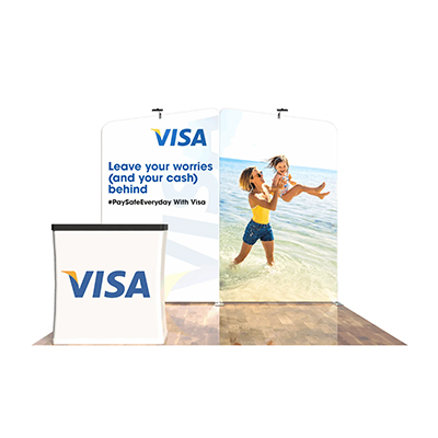 The future of large, affordable marketing displays is here. The WaveLine stretch fabric displays are built with a simple and lightweight, yet strong, aluminum tube frame zipped inside a wrinkle-resistant polyester fabric graphic print. Sets up quickly without tools. Print double-sided fabric graphics for a full walk-around experience or flip your panel around to display an alternative message when needed. Accessories are available for your display including waterfall shelving, monitor mounts and case to counter kits. Choose from designed kits or mix and match to create your own.